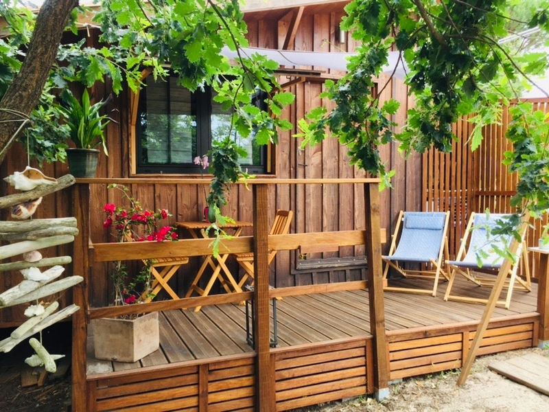The ZEN OCEAN guest room is a wooden cabin away from our house, overlooking a flower garden. You will appreciate the relaxing atmosphere and the flowery outdoor spaces, on the edge of the forest. Our travelers can recharge their batteries, with the sound of the waves and the birds in the morning; They will discovern secret passage at the bottom of the garden directly overlooking the forest which leads to the ocean. A charming private wooden terrace, surrounded by greenerye and flowers overlooking the oaks allows you to have breakfast in the open air, facing south and sheltered. We only rent a room on the forest side to ensure the tranquility of travelers and preserve the intimate character of the place. Sun loungers are placed on the private south-facing terrace.